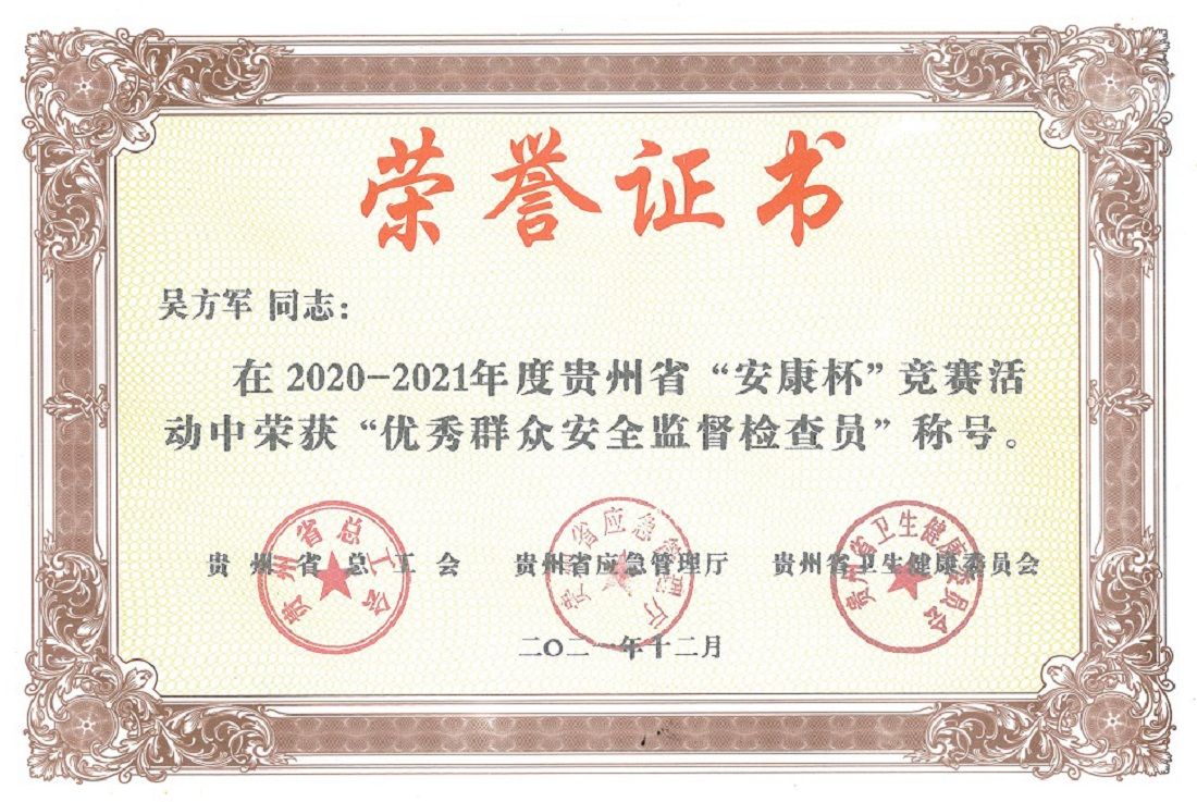 同時,集團公司吳方軍同志在該次評選中榮獲“貴州省優(yōu)秀群眾安全監(jiān)督檢查員”稱號。