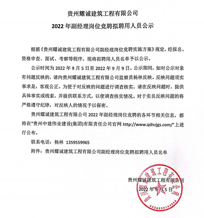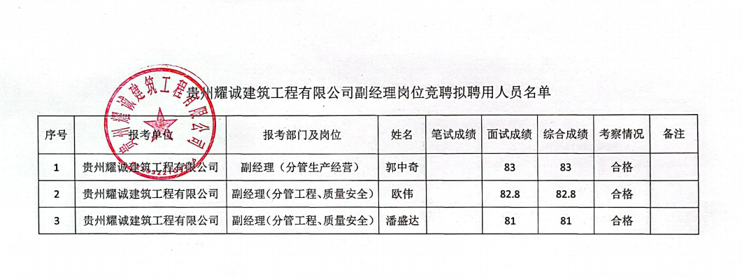 貴州耀誠建筑工程公司2022年副經(jīng)理崗位競聘擬聘用人員公示