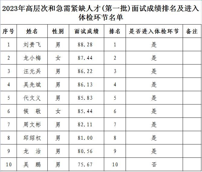 附件:2023年高層次和急需緊缺人才(第一批)面試成績排名及進(jìn)入體檢環(huán)節(jié)名單