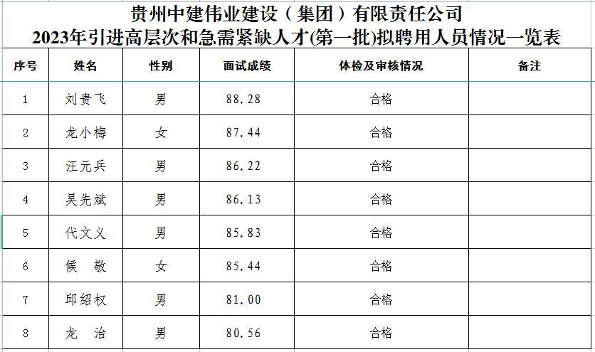 根據(jù)《貴州中建偉業(yè)建設(集團)有限責任公司高層次人才和急需緊缺人才引進工作方案》,經(jīng)報名、資格審查、面試、體檢和考察等程序,劉貴飛等八位同志列入貴州中建偉業(yè)建設(集團)有限責任公司2023年引進高層次和急需緊缺人才(第一批)擬聘用對象(詳見附件),現(xiàn)予以公示。