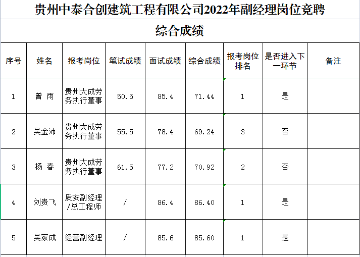 貴州中泰合創(chuàng)建筑工程有限公司2022副經(jīng)理崗位競(jìng)聘綜合成績(jī)名單公示